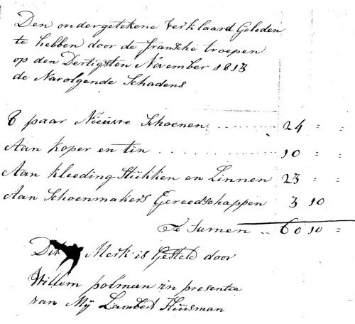 Na het einde van de oorlog maakte de Burgemeester van Naarden bekend, dat alle ingezetenen een eigenhandig ondertekende verklaring, met opgave van de geleden schade door plundering en vernielingen door de soldaten, konden indienen. Ook de schade door het beleg van Naarden en de bombardementen kon gedeclareerd worden. Deze moesten binnen 4 dagen worden ingeleverd en wel op maandag 30-05-1814 tussen 9 en 10 uur, op de secretarie van het stadhuis van Naarden.