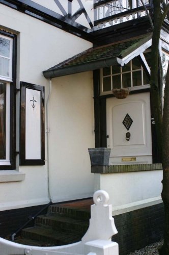 De ingang aan de noordkant is bereikbaar via drie gemetselde traptreden. Rechts van de deur is een lamp geplaatst die ontworpen is door de architect. Een stuk naar links, in het oostelijke deel, is nog een deur, waarvoor men ook eerst drie treden moet beklimmen. Daartussen zijn vijf gekoppelde dubbelvensters zichtbaar. Het westelijke gedeelte bevat op de begane grond een venster met groene en gele glas-in-loodramen. Op de hogere verdieping zijn vijf vierkante vensters geplaatst. Aan de rechterkant bevindt zich een hoge, gemetselde schoorsteen. De linker zijgevel is iets doorgetrokken naar de noordzijde en omvat links twee bouwlagen en rechts een bouwlaag. Op de tweede bouwlaag bevindt zich onder andere een breed raam met decoratieve, geometrische glas-in-lood indeling.