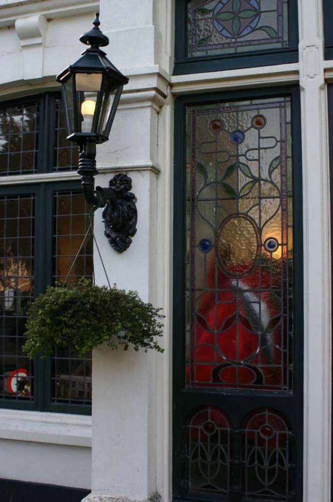 Als we de donkergroene lantaarn in zijn geheel bekijken kunnen we een aantal art nouveau-elementen aanwijzen in de versieringen van het smeedwerk. De lampenhouder is opgebouwd uit een verticaal deel dat bestaat uit vier rechthoekige staven die om een ronde buis geplaatst zijn en onderling met elkaar zijn verbonden. De staven worden aan de voet gesteund door bogen, en tussen de verticale staven zit dun, plat en sierlijk smeedijzer als decoratie. Boven eindigen de staven in een sierlijke krul. Daarboven lopen vier halfrond gebogen staven die samen twee cirkels vormen, waardoor een gedecoreerde platte band loopt. Deze combinatie suggereert een bol waaraan de vier lichtpunten zijn bevestigd. De lichtpunten bestaan uit een buis die uitloopt in twee buizen die de gracieuze lampenkap dragen met daarin de verlichting. De middenbuis van de lampenhouder loopt door de open bol heen en vormt met een krul en andere versieringen de bekroning die eindigt in een rond kapje.