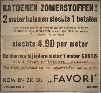 Ondernemers weten altijd iets aantrekkelijks te verzinnen om aandacht te vragen voor hun handelswaar. Dat is helemaal van nut in rustige tijden zoals de zomermaanden: mooie advertenties in kranten die verder veel komkommer nieuws bevatten. Ook de Historische Kring Bussum probeert zo de website kolommen te vullen: een zomergreep uit onze vooraad oude advertenties.