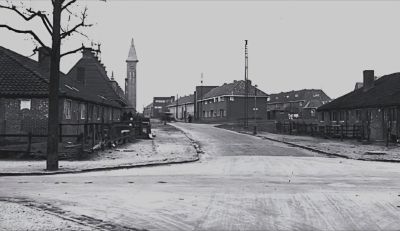 Aan weerszijden van de Keizer Ottostraat stond bij de Voormeulenweg destijds een blokje van vier stenen noodwoningen. Ze waren gebouwd in 1920 en bewoond tot de afbraak in 1932, toen deze foto werd genomen. Aan het einde van de straat staat de R.K. Heilig Hartkerk, gebouwd in 1931. Op het moment dat deze foto werd gemaakt was de kerk nog niet in gebruik. In 1982 ging de kerk dicht en negen jaar later volgde de sloop.