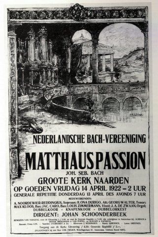 Goede Vrijdag 14 april 1922 werd de Matthäuspassion voor de eerste keer in de Grote Kerk van Naarden uitgevoerd. Ongeveer een half jaar eerder was de Nederlandsche Bachvereniging opgericht. Johan Schoonderbeek was de eerste dirigent (zie foto) en hij werd opgevolgd door achtereen-volgens Evert Cornelis, Anton van der Horst en Charles de Wolff.