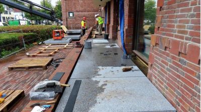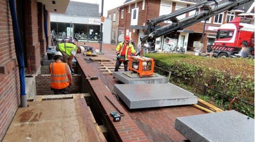 Werklieden hebben de laatste hand gelegd aan de vervolmaking van de hellingbaan die toegang geeft tot het documentatiecentrum van de HKB. Er zijn loodzware blokken neergelegd van Portugees graniet, anderhalve ton per stuk. Het ziet er mooi uit, maar er is een klein probleem ontstaan met de toegang naar de vloer van het DC. Die ligt nu wat lager! Onvoorbereide bezoekers kunnen daardoor worden verrast. (foto's Jaap van Hassel)