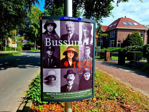 In de aanloop naar de viering van het 40-jarig HKB-jubileum in september vestigt onze vereniging op diverse manieren de aandacht op de komende tentoonstelling over het Bussum van honderd jaar geleden. De expositie zal kunnen worden bezocht in de kapel van Mariënburg rond de Open Monumenten Dagen. Keus genoeg voor uw agenda: 2, 3, 9, 16 en 23 september van 12.00-16.00 u. Voor wie er er langs de openbare weg nog geen eentje gezien heeft: hieronder een HKBillboard van dichtbij.