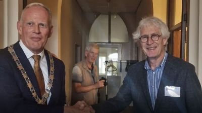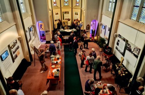 De 40-jarige Historische Kring Bussum beleefde zaterdag 2 september een geslaagde opening van de jubileum-tentoonstelling. Mensen stroomden toe naar het voormalige klooster Mariënburg in het centrum van Bussum om de opening bij te wonen. Voorzitter Nol Verhagen lichtte in een korte toespraak toe wat de aanleiding was voor het thema van de expositie: Bussum in 1923. Burgemeester Han ter Heegde haakte daarop in en prees ook de Kring om al het belangrijke werk dat door vrijwilligers werd en wordt verricht. Hij nam wat de resultaten betreft zelfs het woord 'wetenschappelijk' in de mond. De twee knipten een lint in de toegangshal door en schudden elkaar de hand. Toen kon het massale trappenlopen naar de bovengelegen kapel beginnen. Helaas niet roltoegankelijk.. De bezoekers vergaapten zich aan de uitgekiende tentoonstelling waarbij diverse historische aspecten op maatschappelijk terrein werden getoond. Op deze openingsdag kon iedereen genieten van jubileumgebakjes en oranjebitter. Die drank was een verwijzing naar de festiviteiten in 1923 van het 25-jarig regeringsjubileum van Koningin Wilhelmina. Ondermeer daarover is gedurende de expositie een bijzondere (stomme) film uit dat jaar te zien. Alles kan nog worden bekeken op zondag 3 september en op zaterdag 9, 16 en 23 september, van 12 tot 16 uur. Toegang is gratis. Bekijk HIER een video van de opening, van Jan Schippers en Jaap van Hassel.