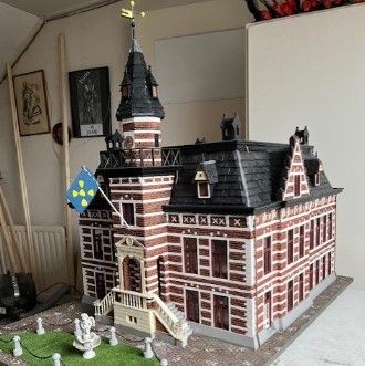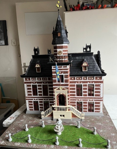 Het oude raadhuis van de gemeente Bussum dat aan de Brinklaan heeft gestaan is op diverse manieren vereeuwigd. Vooral als resultaat van huisvlijt. Onze vereniging heeft onder meer een wit-kartonnen exemplaar mogen bewonderen en een van legoblokjes. De makers hebben alles in het werk gesteld om het geliefde raadhuisje zo getrouw en minutieus mogelijk op schaal na te bouwen. Het nieuwste en misschien wel mooiste werkstuk is ons dezer dagen onder ogen gekomen. Het is van de hand van de heer Kerkenaar van de herenmodezaak Old England aan Brinklaan 81. Dat is niet ver van de plaats waar het raadhuisje heeft gestaan. De maker, die als kind op de trappen van het gebouw heeft gespeeld, heeft tekeningen gezocht en heeft uiteindelijk wat gevonden in het gemeente-archief in Naarden, waar men heel behulpzaam was. De heer Kerkenaar heeft zich beperkt tot het hoofdgebouw, omdat de latere aanbouwsels volgens hem afbreuk zouden doen aan het geheel. Voorlopig wordt het werkstuk waarschijnlijk tentoongesteld in de herenmodezaak. Onze vereniging wil graag meedenken over een meer definitieve plaats.