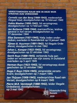 Daar is vijf jaar geleden op initiatief van de Historische Kring Bussum een plaquette aangebracht op een blinde muur. In aanvulling daarop is twee jaar geleden in het plantsoen ervoor een gedenkbord onthuld met extra informatie over de elf verzetsmensen. Een QR-code verwijst naar een speciale pagina op de website van de Historische Kring Bussum.