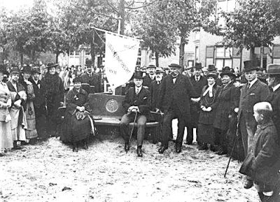 Onderstaand een foto van de bank die in 1920 op het Bussumse Wilhelmina-plantsoen werd geplaatst ter gelegenheid van de invoering van het vrouwenkiesrecht. De bank werd aan de gemeente aangeboden door de afdeling Naarden-Bussum van de Vereniging voor Vrouwenkiesrecht. Burgemeester De Bordes spreekt de vrouwen belerend toe.