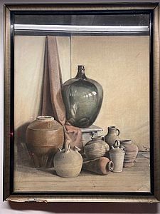 Het is een tekening (stilleven, pastelkrijt op papier), gedateerd 13-11-1931 en gesigneerd met A.H.M.? Pijpers. We zouden graag willen weten of dit werk toe te schrijven is aan de Bussumse kunstenaar Arnold Pijpers (1900-1951).