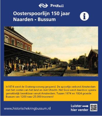 150 jaar geleden is het eerste deel geopend van de Oosterspoorlijn tussen Amsterdam en Amersfoort en de zijtak naar Utrecht Maliebaan. Station Naarden-Bussum is een van de stations aan deze lijn. Zie de website van Pro Rail voor meer informatie.